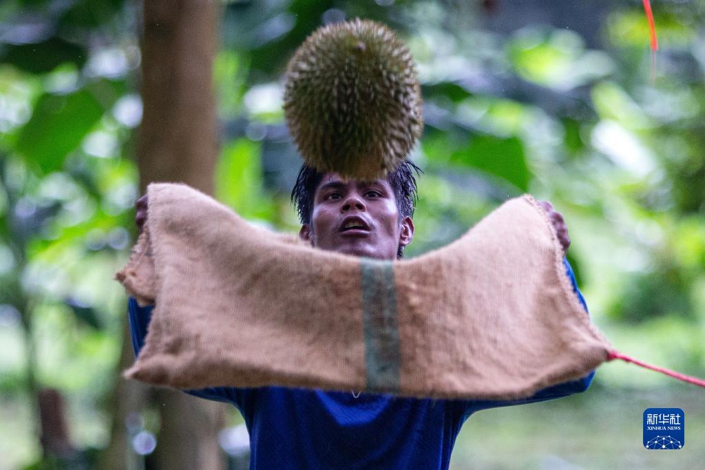 9月18日,在泰国春蓬府一处果园内,工人在树下接榴莲。