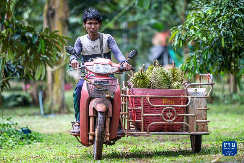 9月18日,在泰国春蓬府一处果园内,工人在运送刚采摘的榴莲。