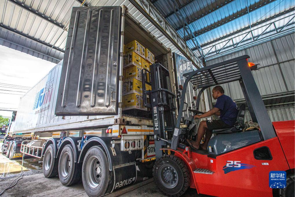 9月19日,在泰国春蓬府一家榴莲工厂内,工作人员将包装好的榴莲装车。