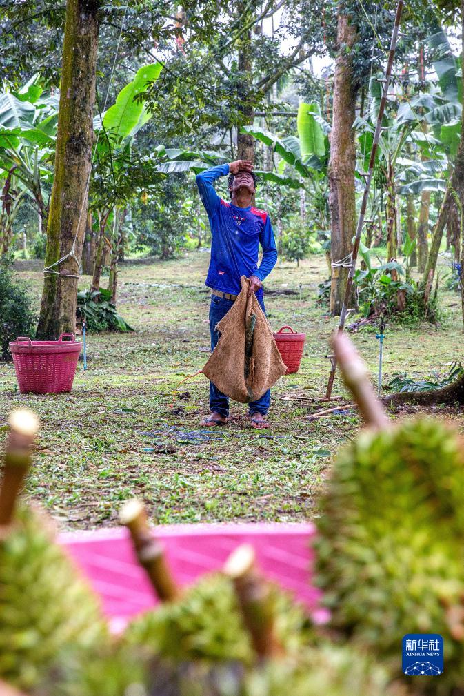 9月18日,在泰国春蓬府一处果园内,工人在树下等待接榴莲。