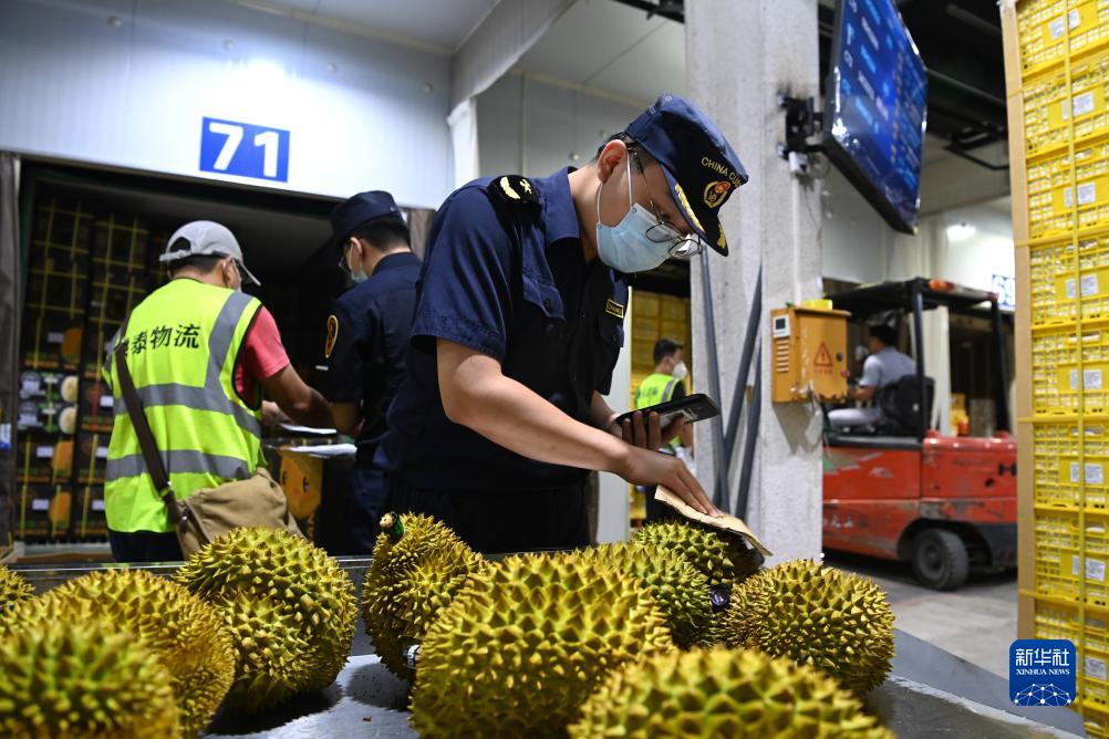 9月12日,在广西凭祥友谊关口岸,海关工作人员对进口的榴莲进行查验。