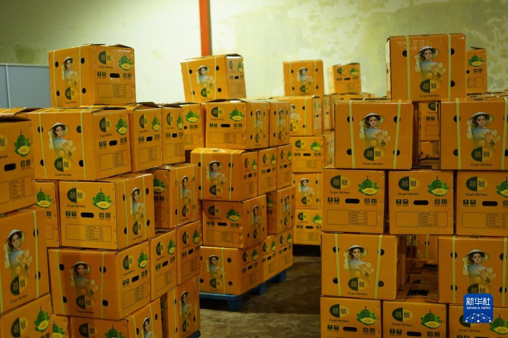 9月15日,在越南多乐省一家榴莲加工厂,包装好的榴莲在等待装车。