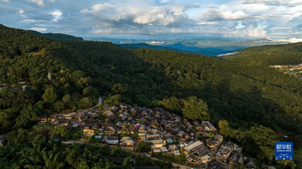 被山林与茶园环绕的景迈山翁基古寨一景(无人机全景照片,9月18日摄)。