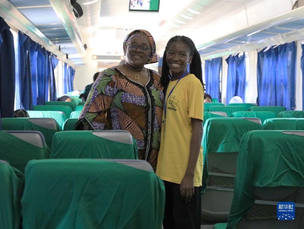 9月18日,在尼日利亚首都阿布贾的阿卡铁路起点站伊都火车站,两名乘客在车厢内留影。