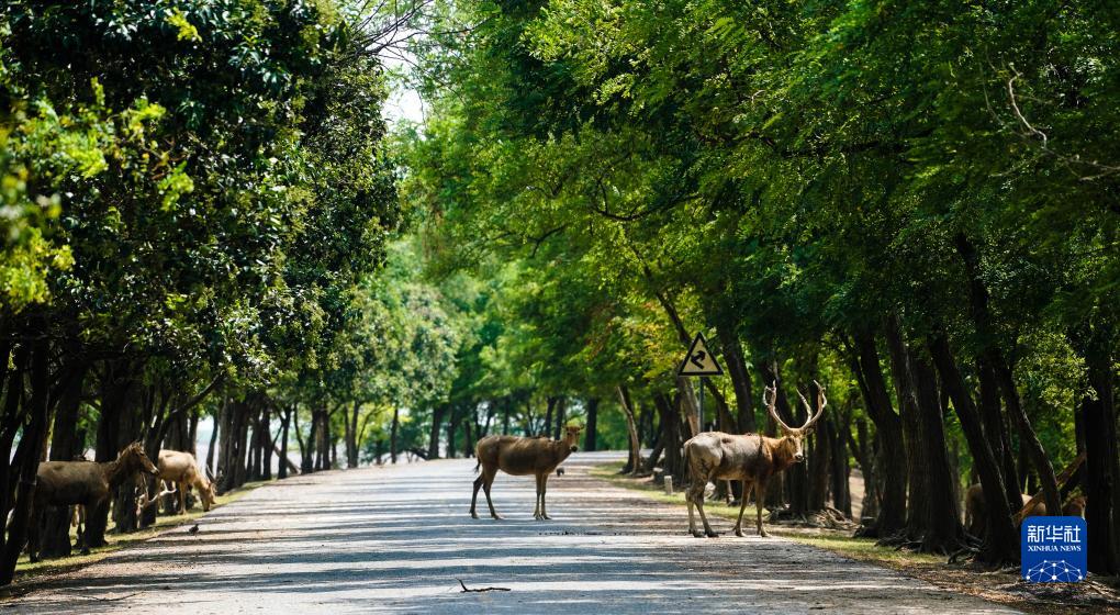 麋鹿生活在江苏大丰麋鹿国家级自然保护区(8月21日摄,无人机照片)。