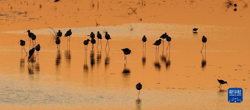 群鸟栖息在夕阳下的东台条子泥湿地(8月31日摄)。