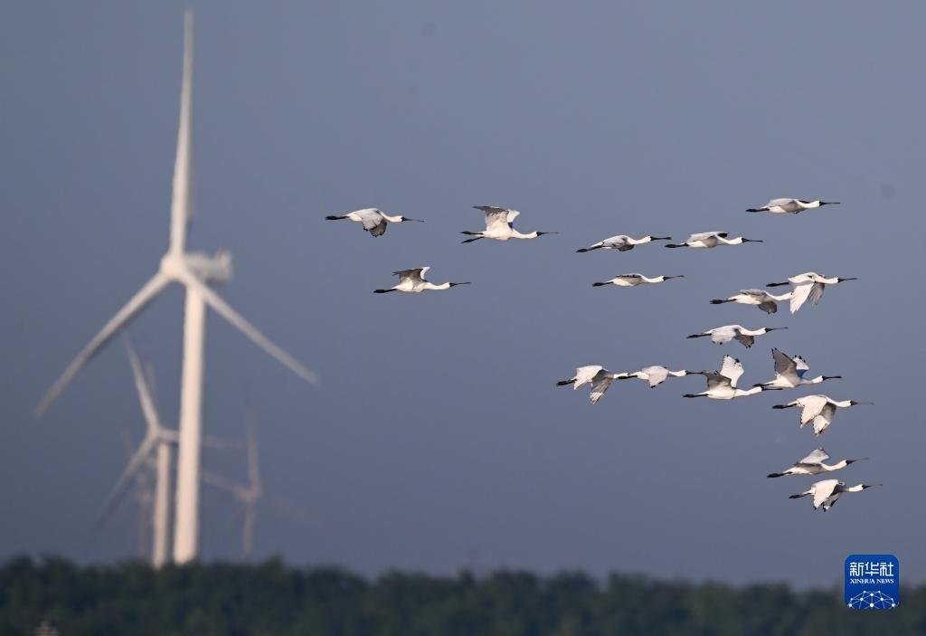 黑脸琵鹭在盐城东台条子泥湿地上空飞翔(9月1日摄)。