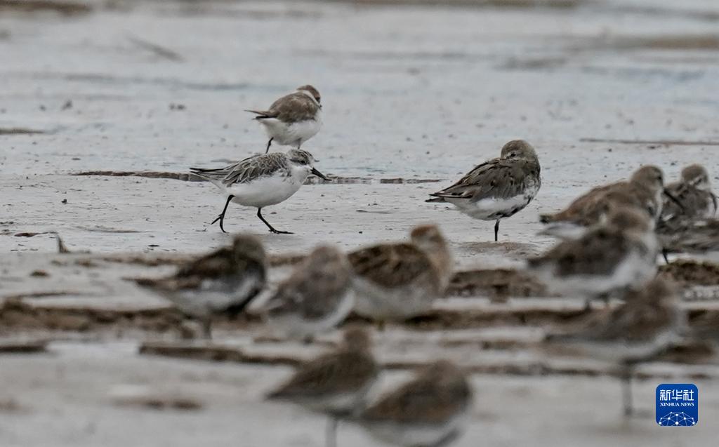 勺嘴鹬(上中)在东台条子泥湿地的滩涂上觅食(8月31日摄)。