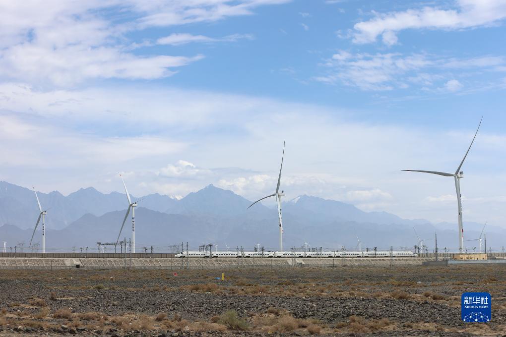 一辆列车驶过新疆达坂城风电场(8月3日摄)。