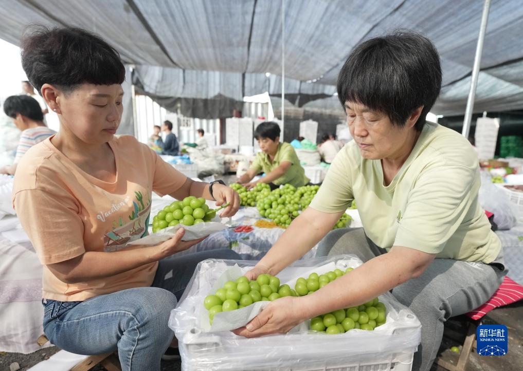 9月20日,河北省晋州市马于镇北辛庄村一家葡萄种植合作社的社员在将采摘的葡萄分拣、装箱。