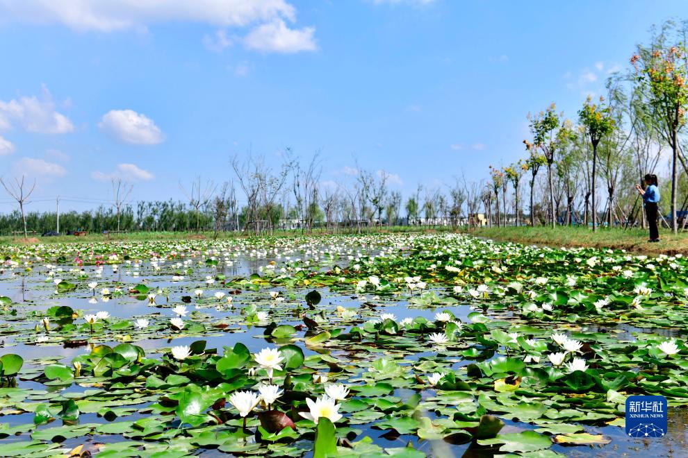 9月20日,在郓城县张营街道乡村振兴示范园,一名市民在荷塘赏花。