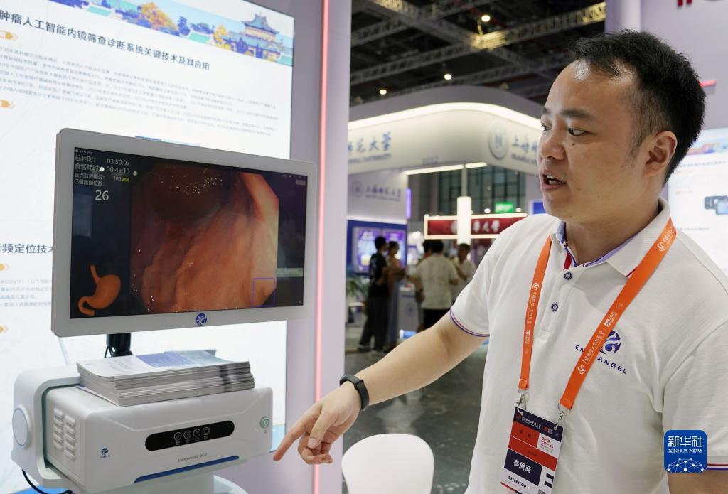 9月20日,武汉大学的展台工作人员介绍消化道肿瘤人工智能内镜筛查诊断系统。