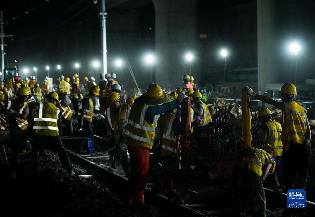 9月19日夜晚,施工人员在沪昆铁路上海七宝至春申段线路上作业。