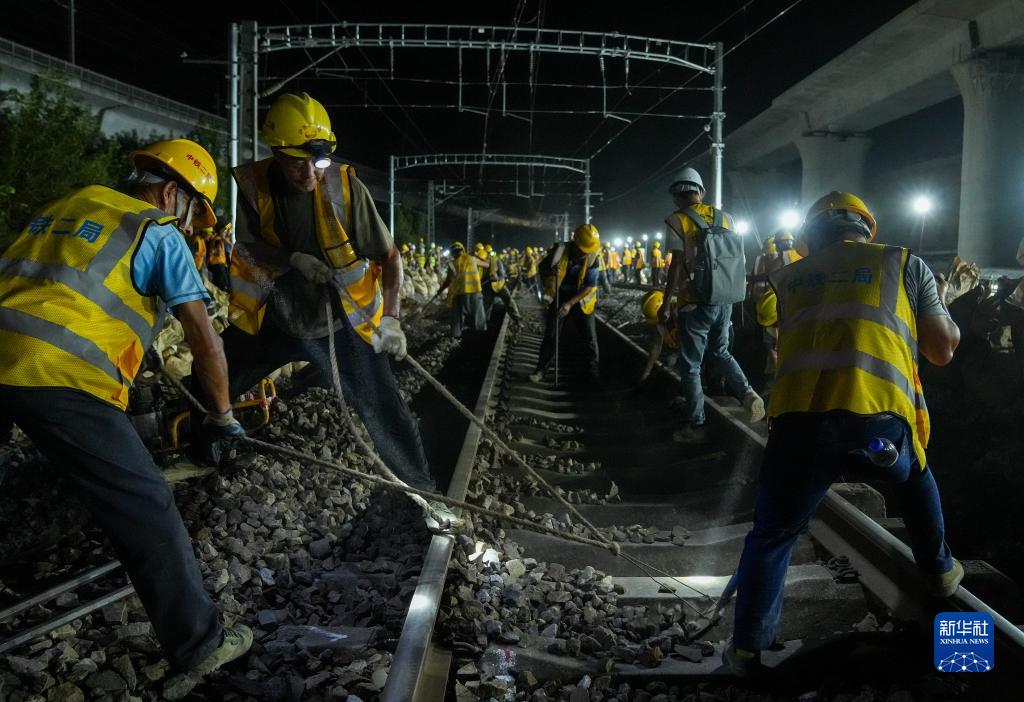 9月19日夜晚,施工人员在沪昆铁路上海七宝至春申段线路上作业。