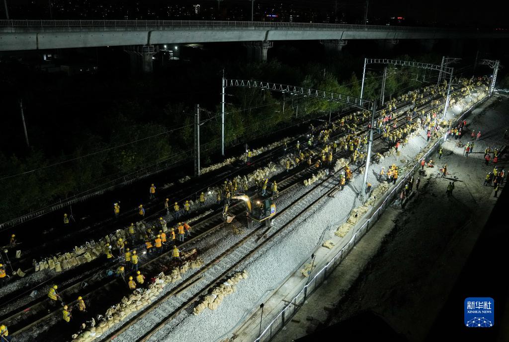 9月19日夜晚,施工人员在沪昆铁路上海七宝至春申段线路上作业。