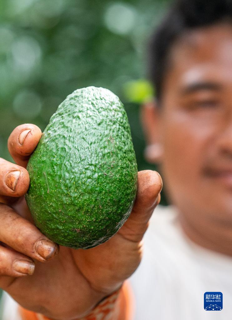 9月20日,孟连县娜允镇南雅村牛油果种植基地的农户展示采摘的牛油果。
