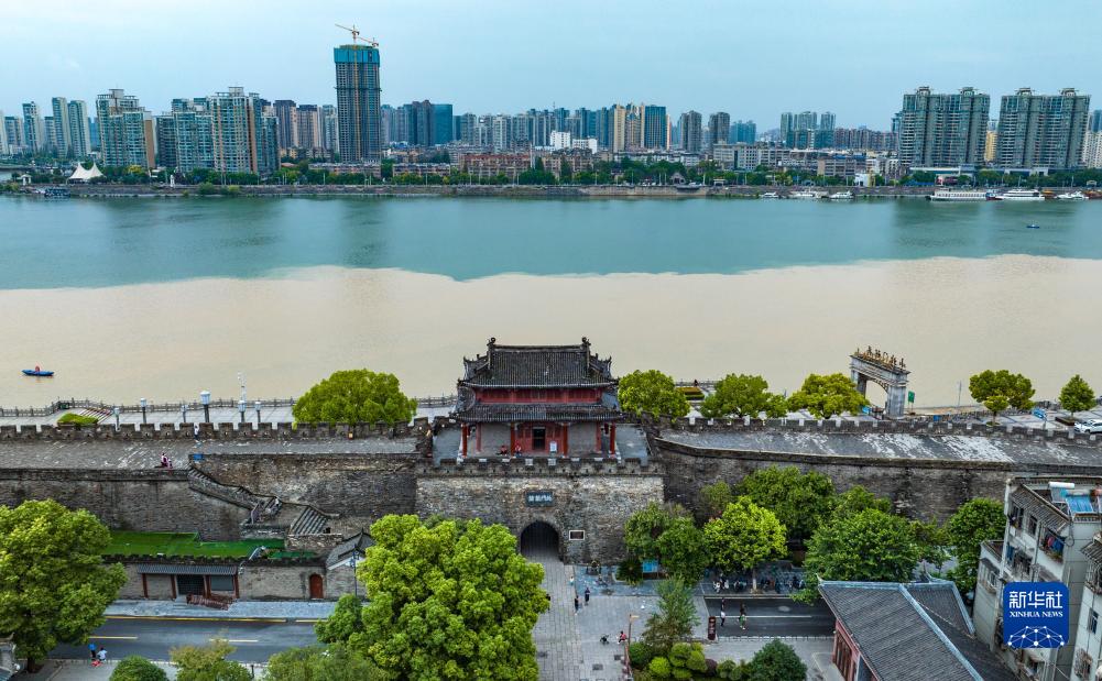 9月20日,受降雨影响,汉江湖北襄阳城区段呈现出“泾渭分明”的景观(无人机照片)。