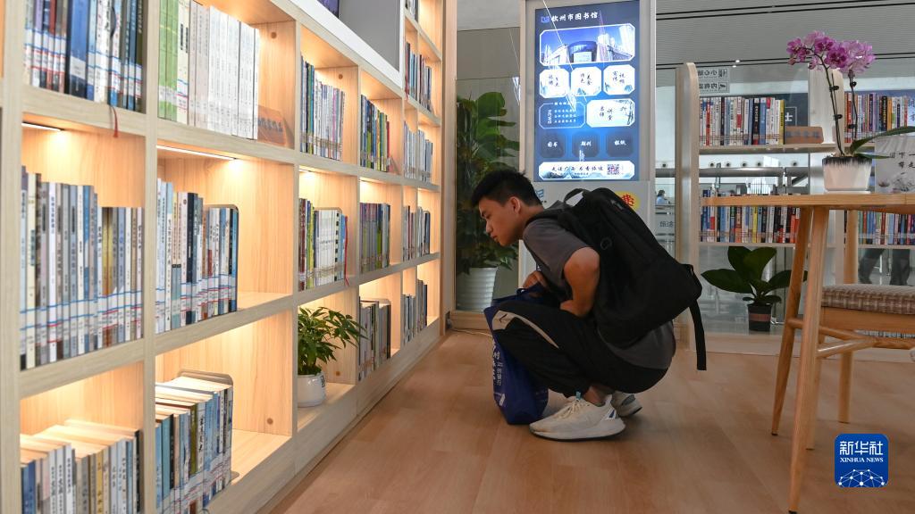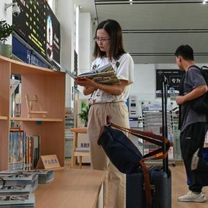 9月20日,在钦州东站,一名乘客在高铁读书驿站寻找心仪的书籍。