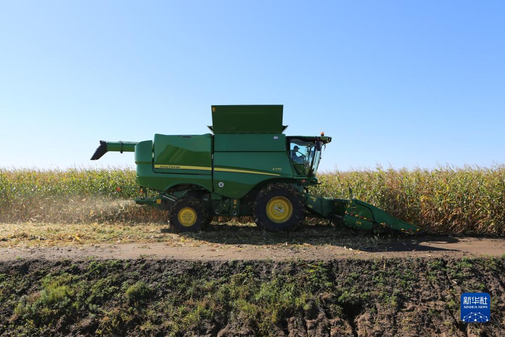 这是9月20日在北大荒农业股份有限公司友谊分公司一玉米种植地块拍摄的秋收现场。