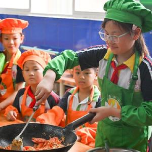 9月20日,重庆市忠县乌杨小学厨艺社团的学生在学习、体验炒菜。