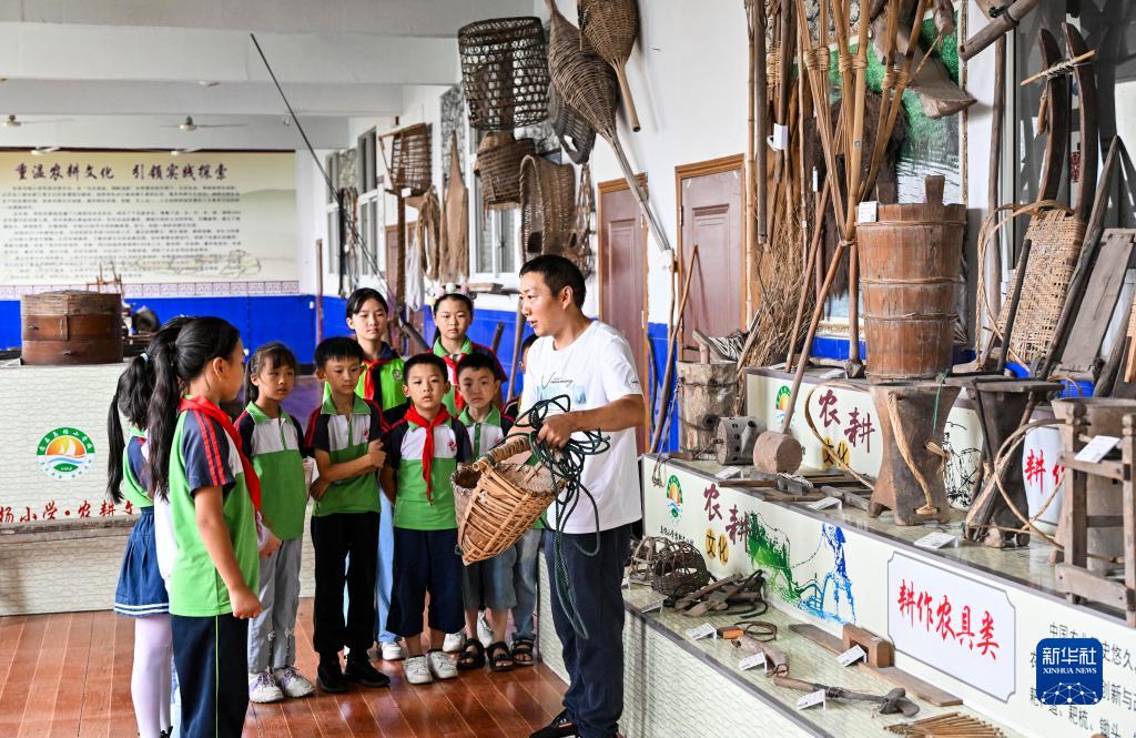 9月20日,重庆市忠县乌杨小学教师在向农耕文化社团的学生介绍农具。