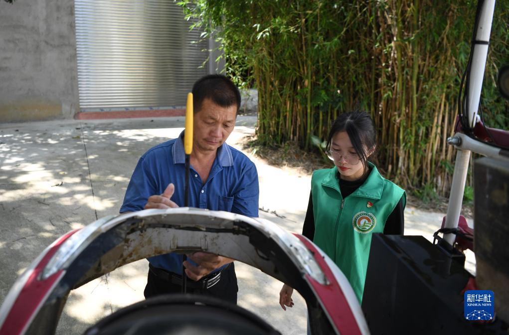9月13日,在广州市增城区石滩镇石湖村的石乡农机专业合作社,父亲沈灿星(左)和沈笑芬在检查农机。
