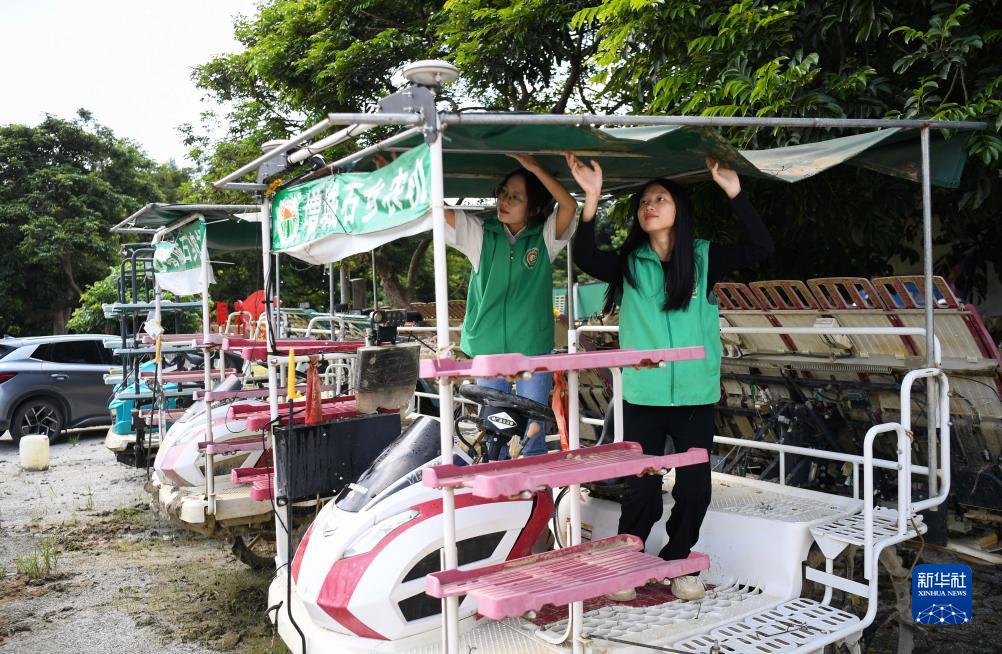 9月18日,在广州市增城区石滩镇石湖村的石乡农机专业合作社,连日大雨后,沈燕芬(左)和沈笑芬清理农机遮阳棚。