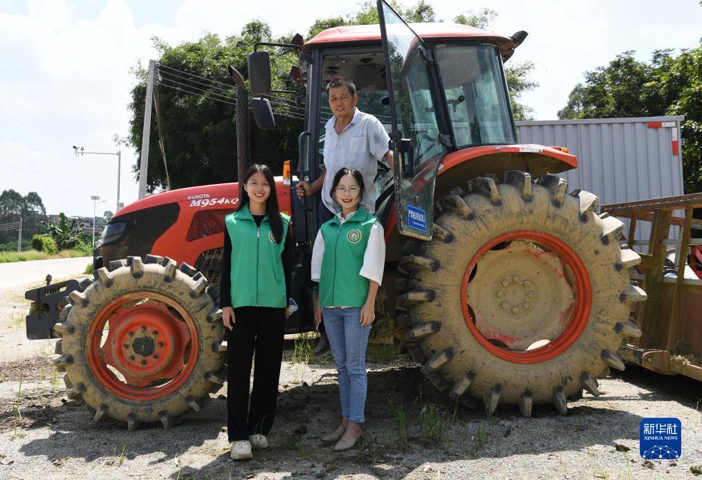 9月18日,在广州市增城区石滩镇石湖村石乡农机专业合作社,沈燕芬(前右)、沈笑芬(前左)和父亲沈灿星在农机前留影。
