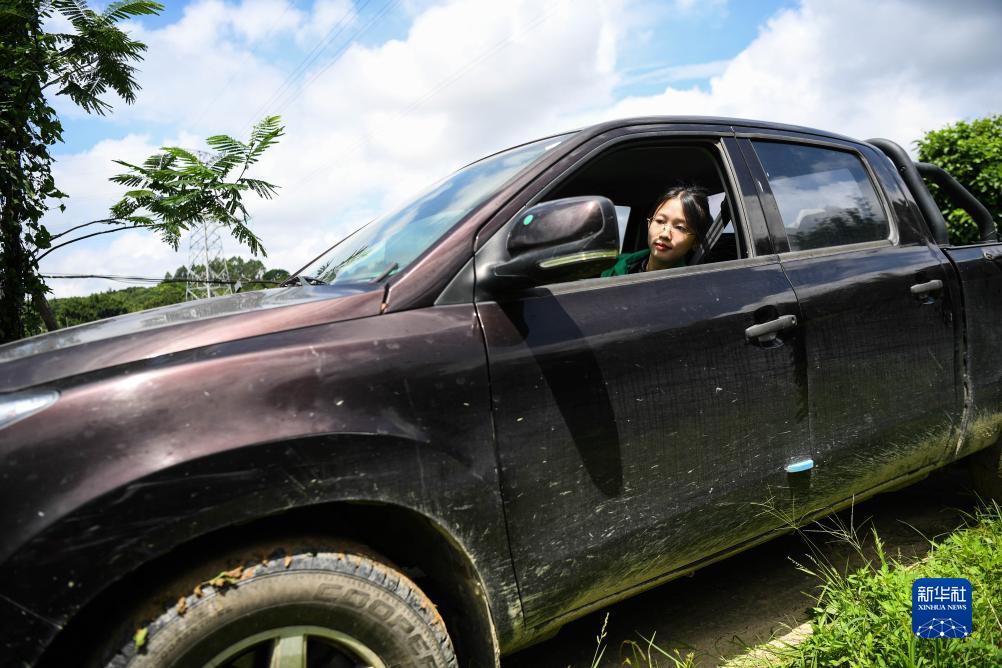 9月13日,位于广州市增城区石滩镇石湖村,沈笑芬在机耕路上边驾驶工作车,边观察道路。