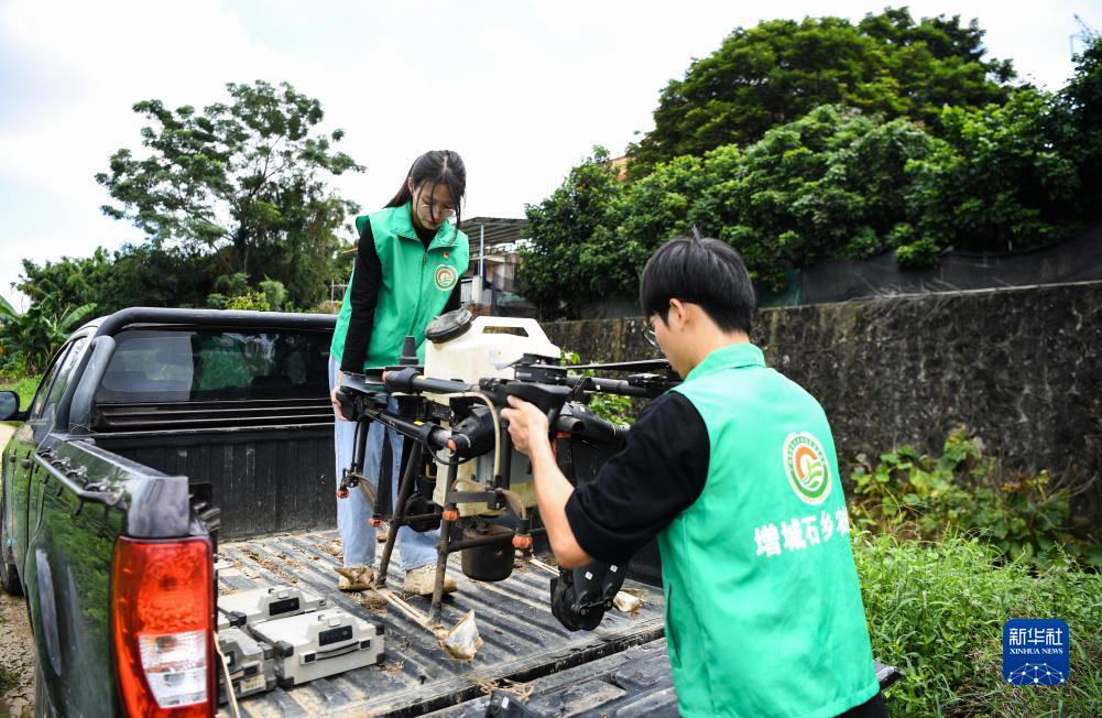 9月13日,位于广州市增城区石滩镇石湖村的一处机耕路上,沈笑芬(左)从车上搬下农用无人机。