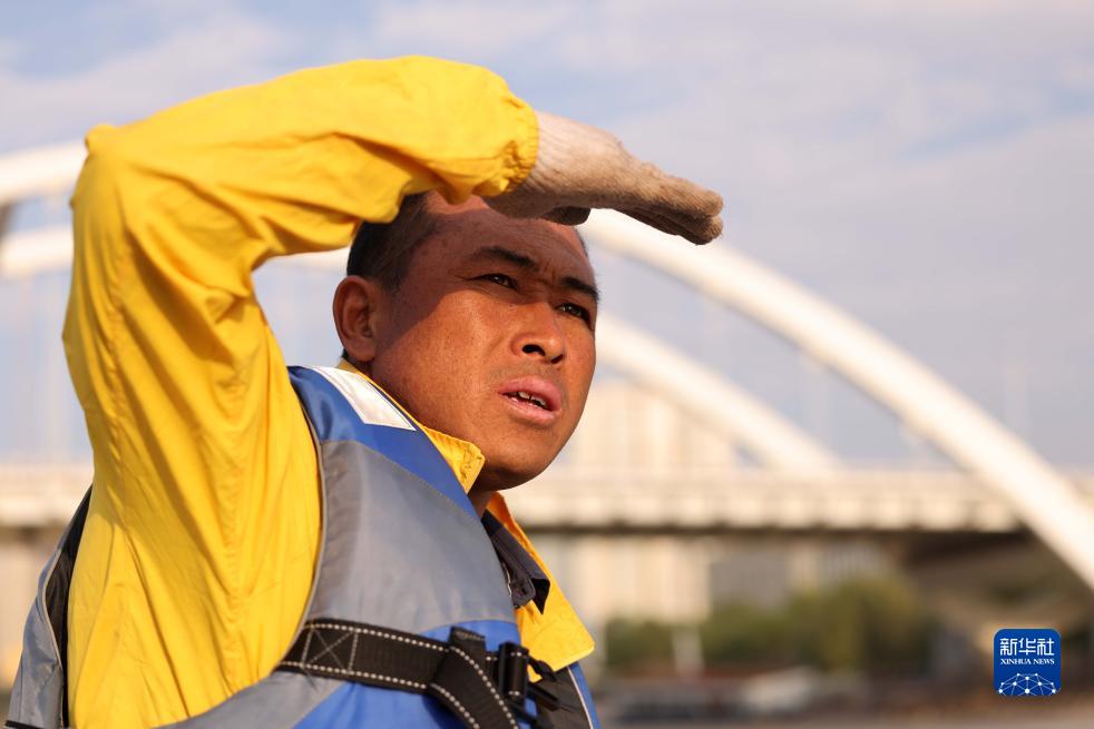 牛强带着游客在黄河甘肃兰州段体验羊皮筏子(9月5日摄)。