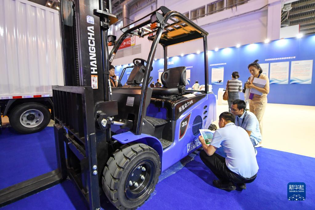 9月21日,在2023世界智能网联汽车大会室内展区,参观者在参观一辆氢燃料电池叉车。
