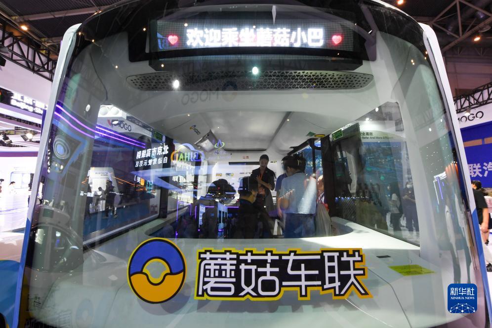 9月21日,在2023世界智能网联汽车大会室内展区,参观者在参观一辆无人驾驶小巴车。