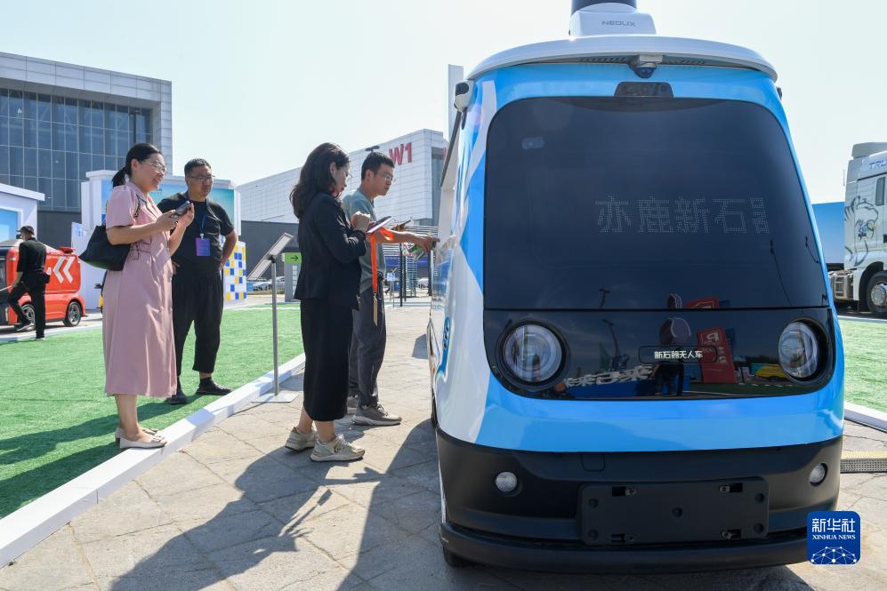 9月21日,在2023世界智能网联汽车大会室外展区,几位参观者在一辆无人零售车前体验购买商品。
