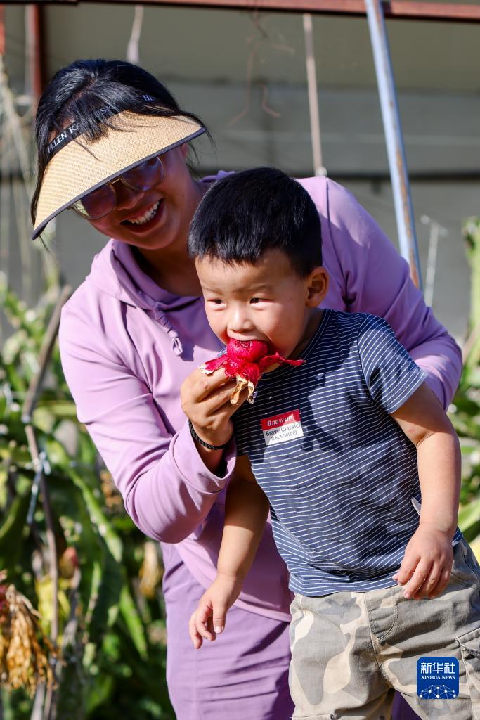 木垒县博泰农业科技开发有限责任公司负责人朱娜给孩子品尝试种的火龙果(9月20日摄)。