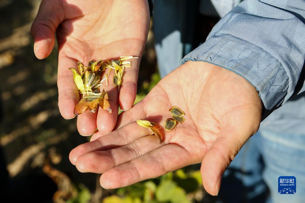 来自福建省武夷山市经济作物技术站的援疆干部黄文庆在观察试种的大叶蛋白菊种子(9月20日摄)。