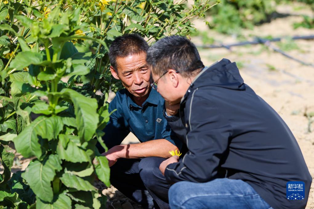 来自福建省南平市光泽县农业农村局的援疆干部吕军(右)与新疆木垒生福生态农业发展有限公司负责人闫生福交流试种的大叶蛋白菊生长情况(9月20日摄)。