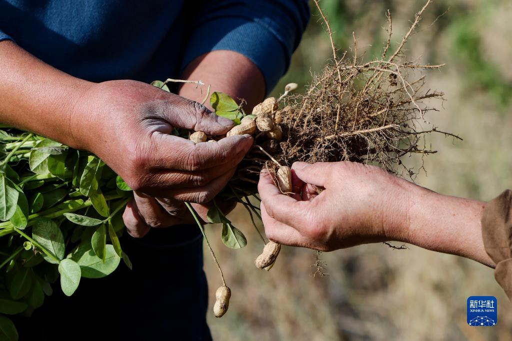 来自福建省南平市光泽县农业农村局的援疆干部吕军(左)与木垒县三畦村交流试种的花生生长情况(9月20日摄)。
