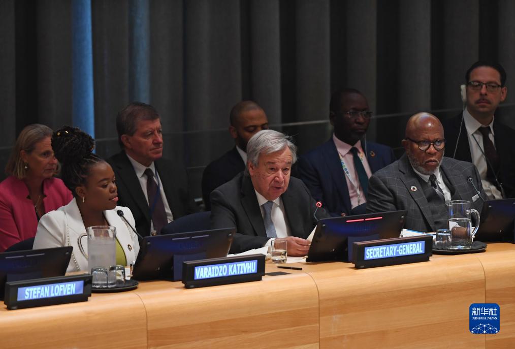 9月21日,在位于纽约的联合国总部,联合国秘书长古特雷斯(前中)在未来峰会部长级筹备会上讲话。