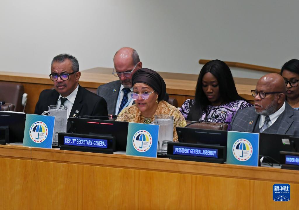 9月21日,在位于纽约的联合国总部,联合国常务副秘书长阿明娜·穆罕默德(前排中)代表联合国秘书长古特雷斯在会议上发言。