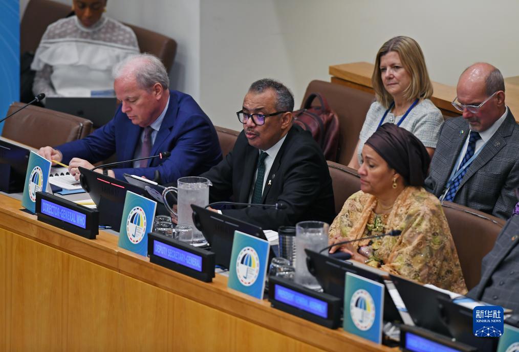 9月21日,在位于纽约的联合国总部,世界卫生组织总干事谭德塞(前排中)在第二次联合国全民健康覆盖问题高级别会议上讲话。