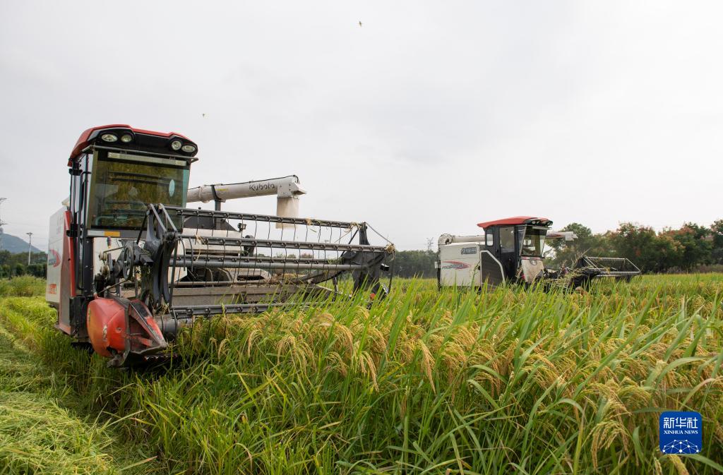 9月21日,在浙江省金华市金东区澧浦镇东湖畈标准农田提升区块,收割机抢收成熟的单季稻。