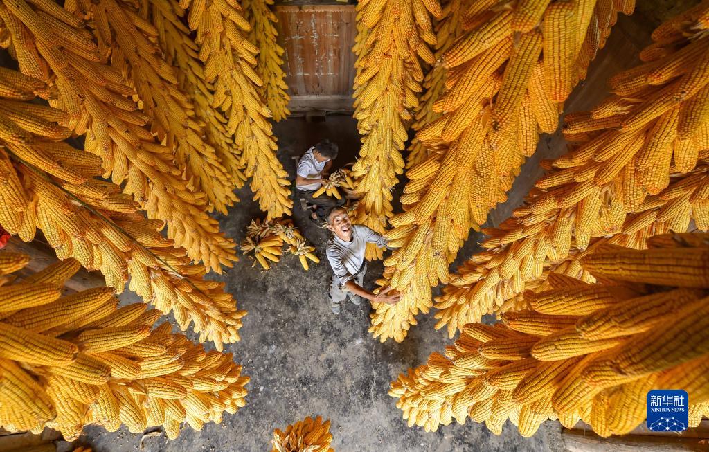 9月19日,贵州省铜仁市松桃苗族自治县九江街道小桂寅社区的农民在晾晒玉米。