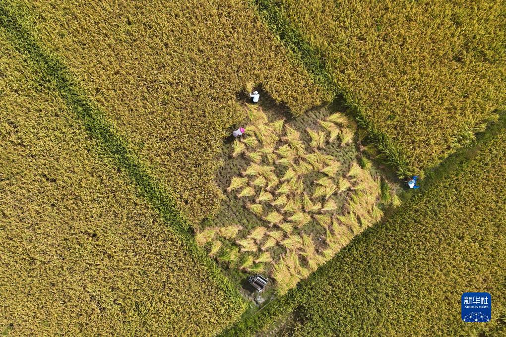 9月19日,重庆市黔江区马喇镇杉树村村民在收获贡米稻谷(无人机照片)。