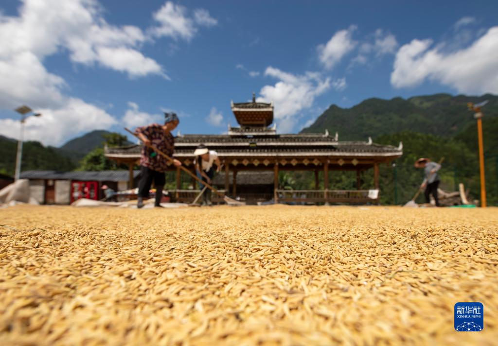 9月16日,村民在贵州省黔东南苗族侗族自治州从江县刚边壮族乡三联村晾晒稻谷。