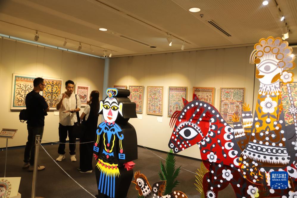 9月21日,在日本东京举行的库淑兰剪纸艺术展预展上,参观者与陕西省美术博物馆工作人员交流。
