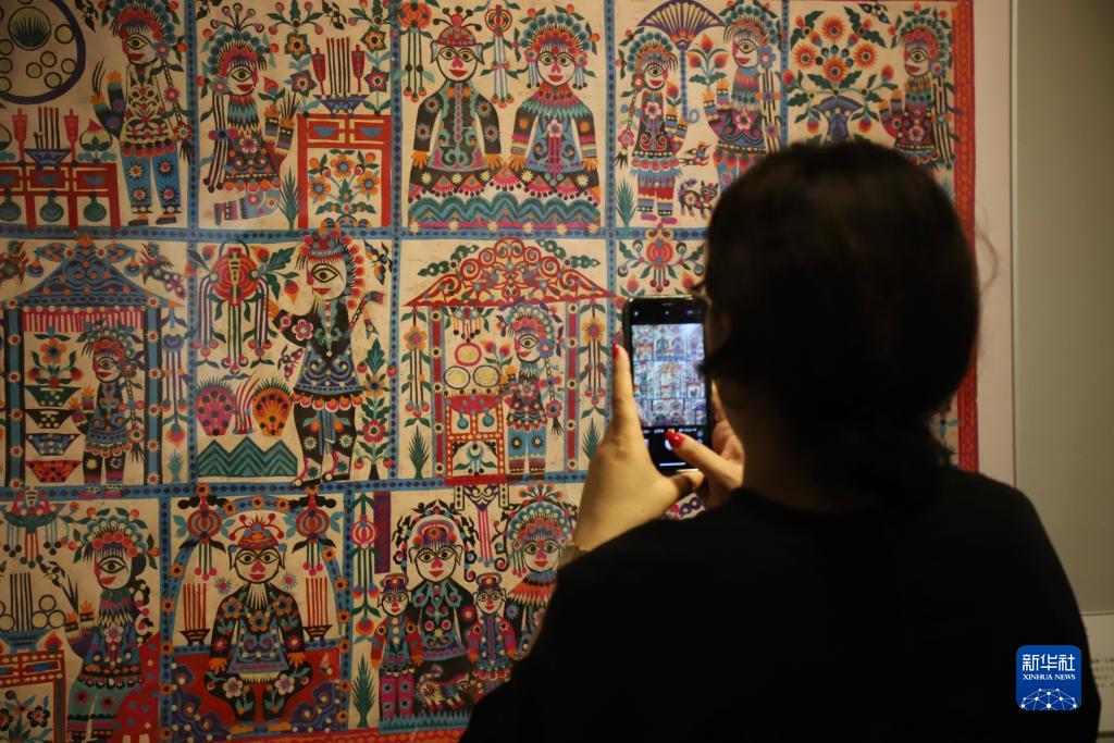 9月21日,一名参观者在日本东京举行的库淑兰剪纸艺术展预展上拍照。