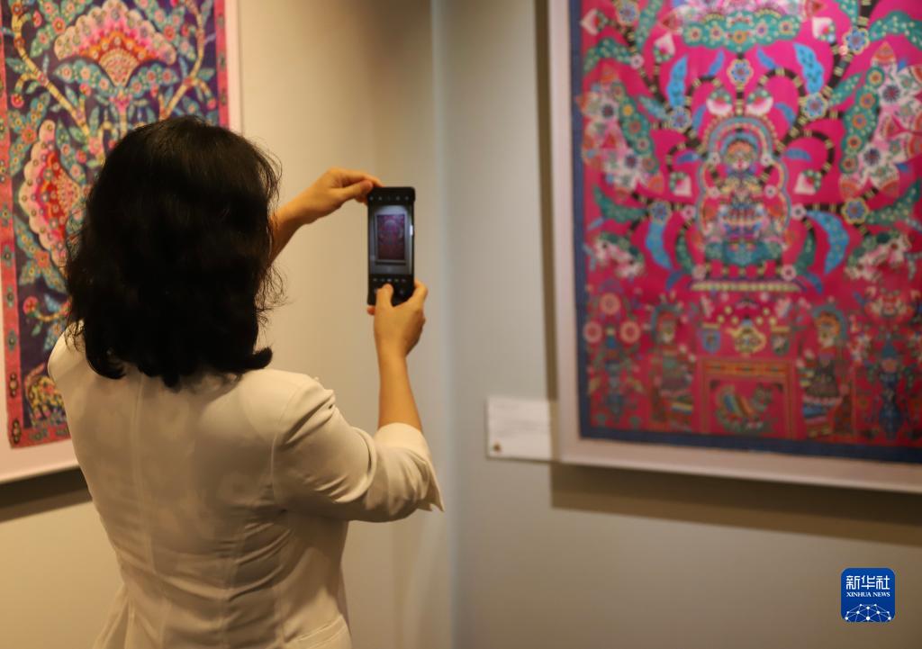 9月21日,一名参观者在日本东京举行的库淑兰剪纸艺术展预展上拍照。