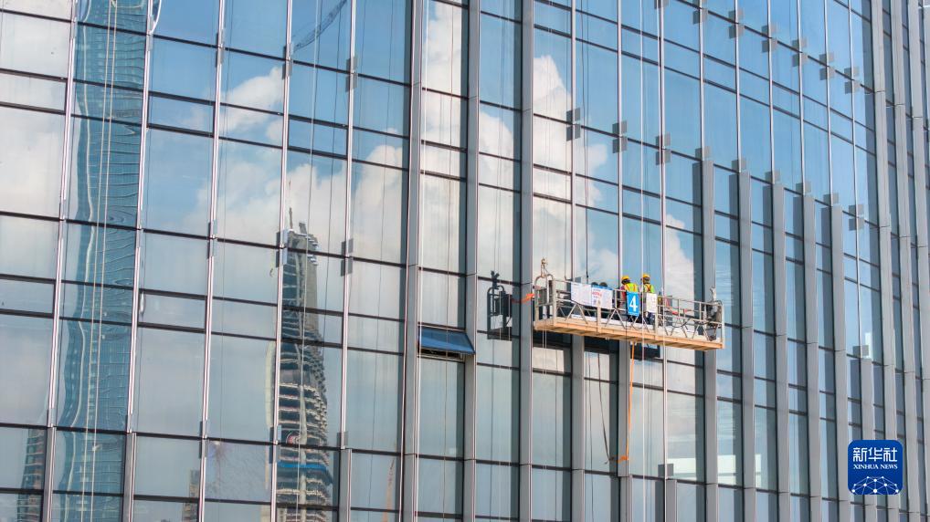 在中国电子集团深圳湾总部基地建设现场,工人在吊篮上进行外立面装饰条安装作业(无人机照片,9月22日摄)。
