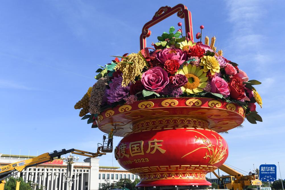 9月22日,施工人员在装饰天安门广场上的“祝福祖国”巨型花篮。